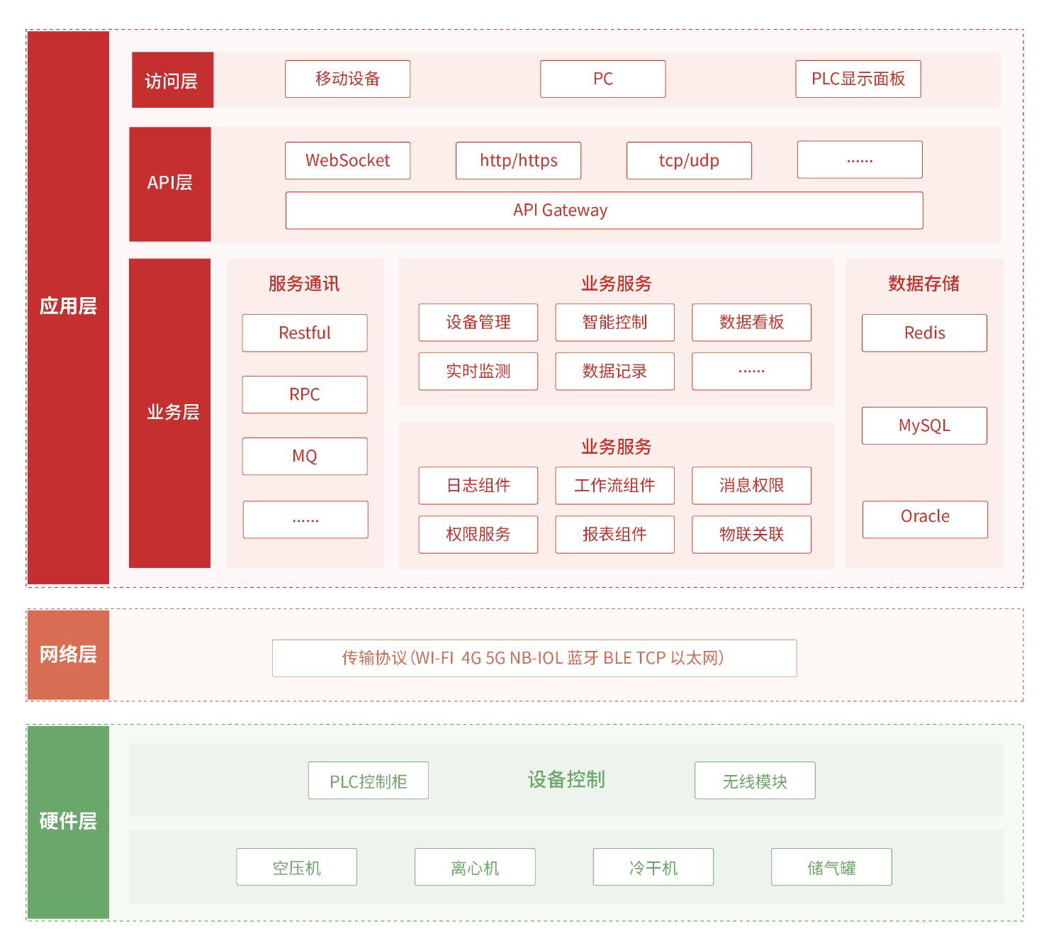 空氣壓縮機是實現(xiàn)生產(chǎn)工藝自動化的重要手段,在鋼鐵、有色金屬冶煉、造船、紡織、化纖、汽車、輪胎等行業(yè)中普遍使用。空壓機長時間處于運行狀態(tài)中,維護難度較大,傳統(tǒng)維護手段主要依賴人工巡檢,難以及時發(fā)現(xiàn)故障,由此帶來的長時間停機會給客戶帶來巨大損失。此外,人工巡檢還存在諸多弊端,如成本高、效率低、難以捕捉全部隱患、信息上傳不及時等問題。并傳統(tǒng)的空壓機控制系統(tǒng)一般采用定時啟停或壓力開關(guān)控制方式,無法根據(jù)實際工況自動調(diào)節(jié)壓縮機的負載、運行狀態(tài)和供氣量,因此無法達到最佳運行效果。