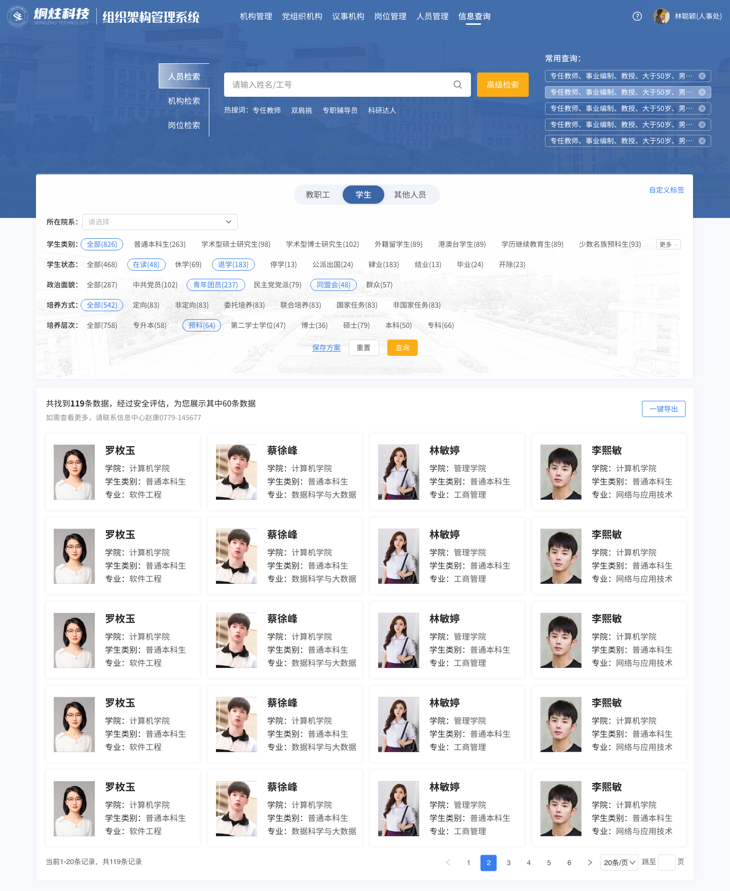 支持對校內(nèi)黨委組織的管理,包括黨基層委員會、黨總支部委員會、黨支部委員會、黨支部等架構(gòu)建立、任期、人數(shù)等自定義設(shè)置;支持可視化描點連線式建立黨組織與行政結(jié)構(gòu)的關(guān)聯(lián)關(guān)系及崗位關(guān)系;支持一鍵生成、導(dǎo)出組織機構(gòu)圖譜;支持批量導(dǎo)入、導(dǎo)出機構(gòu)信息;支持根據(jù)年齡、黨齡、任期等自定義設(shè)置預(yù)警提醒(政治生日、換屆、退休等)。