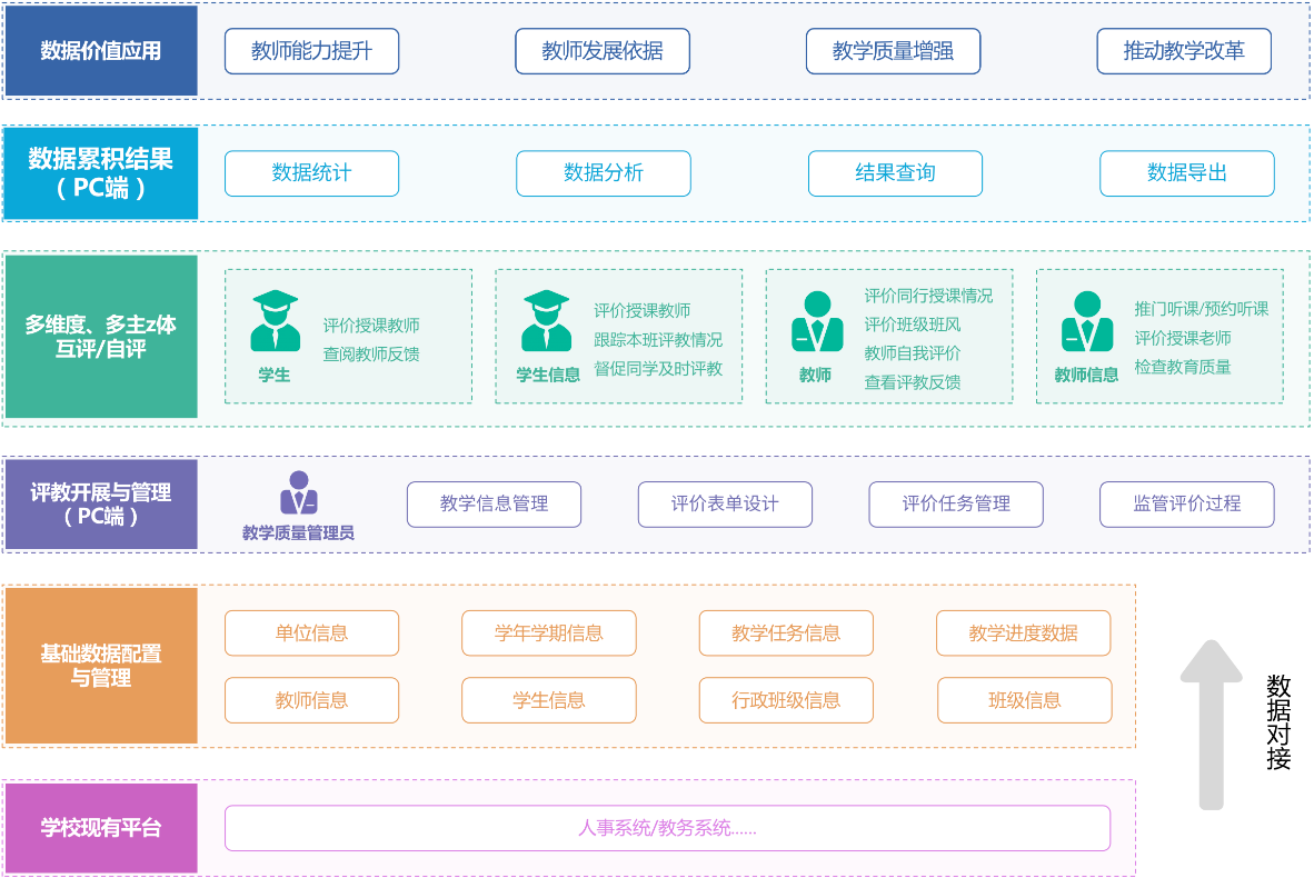 提供預(yù)約聽課評(píng)價(jià)、觀摩聽課評(píng)價(jià)、個(gè)人評(píng)價(jià)、學(xué)生及同行反饋信息化工具,方便現(xiàn)場(chǎng)聽課并發(fā)現(xiàn)、記錄問題;支持事后開展同行交流,反饋教學(xué)評(píng)價(jià)、授課教師反思教學(xué)行為,改進(jìn)教學(xué)方法。將同行聽課與評(píng)課、評(píng)教等工作協(xié)同起來。